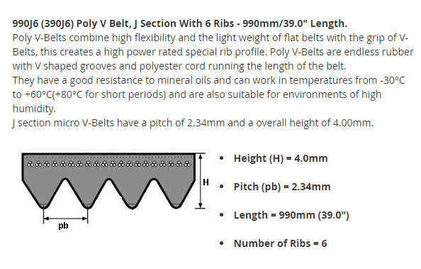 A few Google searches later, I was initiated into the world of Poly-V belts, and their various standards. These are your typical driving belts, used in anything from home appliances, cars, to heavier industrial machinery — with different standard types according to their application. A quick measurement of the distance between the grooves on the wheels suggested that I needed a J-type profile (2.34mm between ridges), and one with 6 ribs. I already knew it was 990mm long.