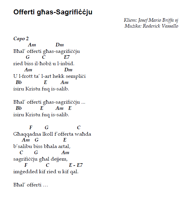 Illum qed naqla’ waħda li ktibt qabel dħalt Ġiżwita (jiġifieri qabel is-sena elfejn, imma naħseb xi 1997 jew 1998). Hija poeżija, maħsuba bħala kant għall-quddiesa. Il-kliem huwa tiegħi, u mużika ta’ Roderick Vassallo.