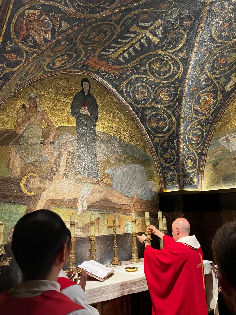 Ir-ritratt? Quddiesa, ma’ grupp ta’ studenti (kważi kollha saċerdoti) fuq l-artal fuq il-Kalvarju, fil-Knisja tal-Qabar ta’ Kristu (jew kif jafuha l-Griegi, l-Anastasis, il-Knisja tal-Qawmien mill-Imwiet!).